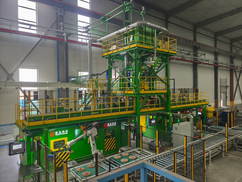 “MZZX200基于智能控制系统的高效刹车盘冷芯盒制芯系统”是专为乘用车刹车盘砂芯规模化生产研发的高端铸造装备。该系统基于智能化集成理念,整合原砂、混砂、制芯及机器人取件浸涂单元,通过自研智能控制系统实现全流程数据闭环交互,突破效率、能耗与智能化瓶颈,填补国内高端冷芯制芯技术空白,推动刹车盘铸造向智能高效化升级。