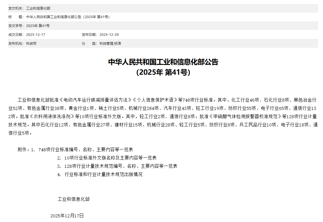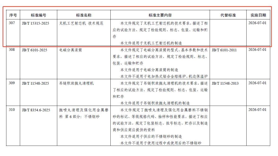 根据中华人民共和国工业和信息化部公告(2025年第41号),由苏州明志科技股份有限公司为第一起草单位的全国铸造机械行业标准JB/T 15315-2025 《无机工艺射芯机 技术规范》,已正式获批首次发布,并将于2026年7月1日正式实施。