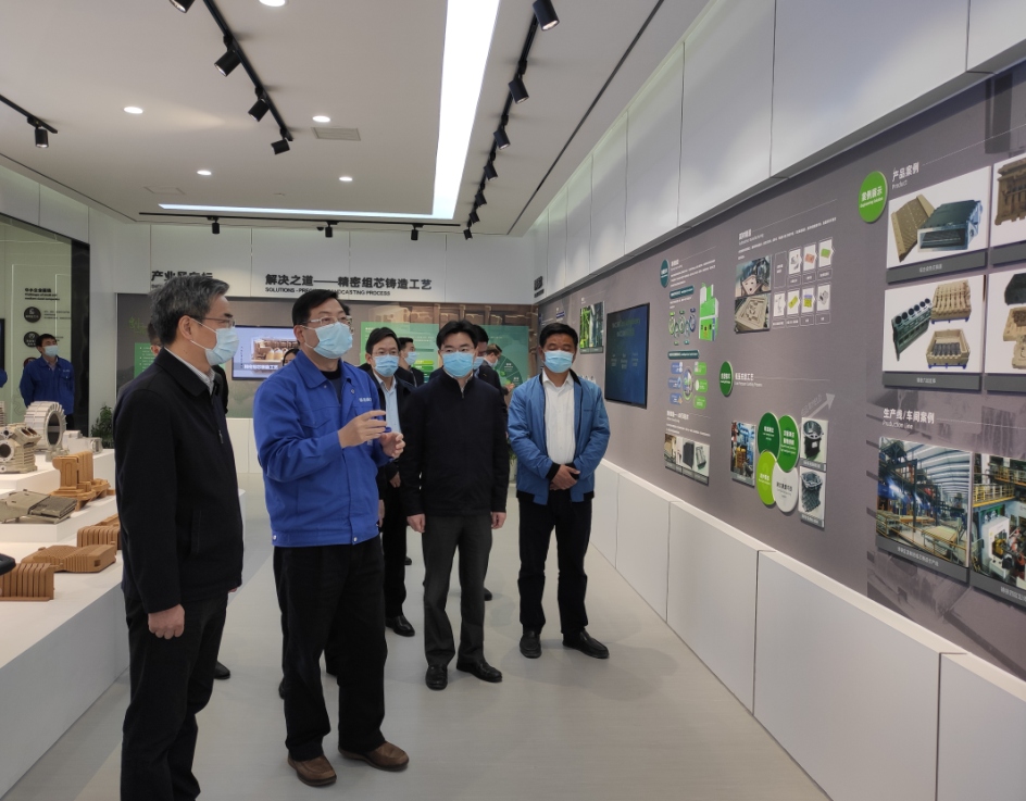 朱书记一行首先参观了明志科技刚刚竣工的铸造行业创新分中心,吴董向他们分别介绍了创新中心的设计理念,铸造行业的发展史、壁垒及相应的解决方案。